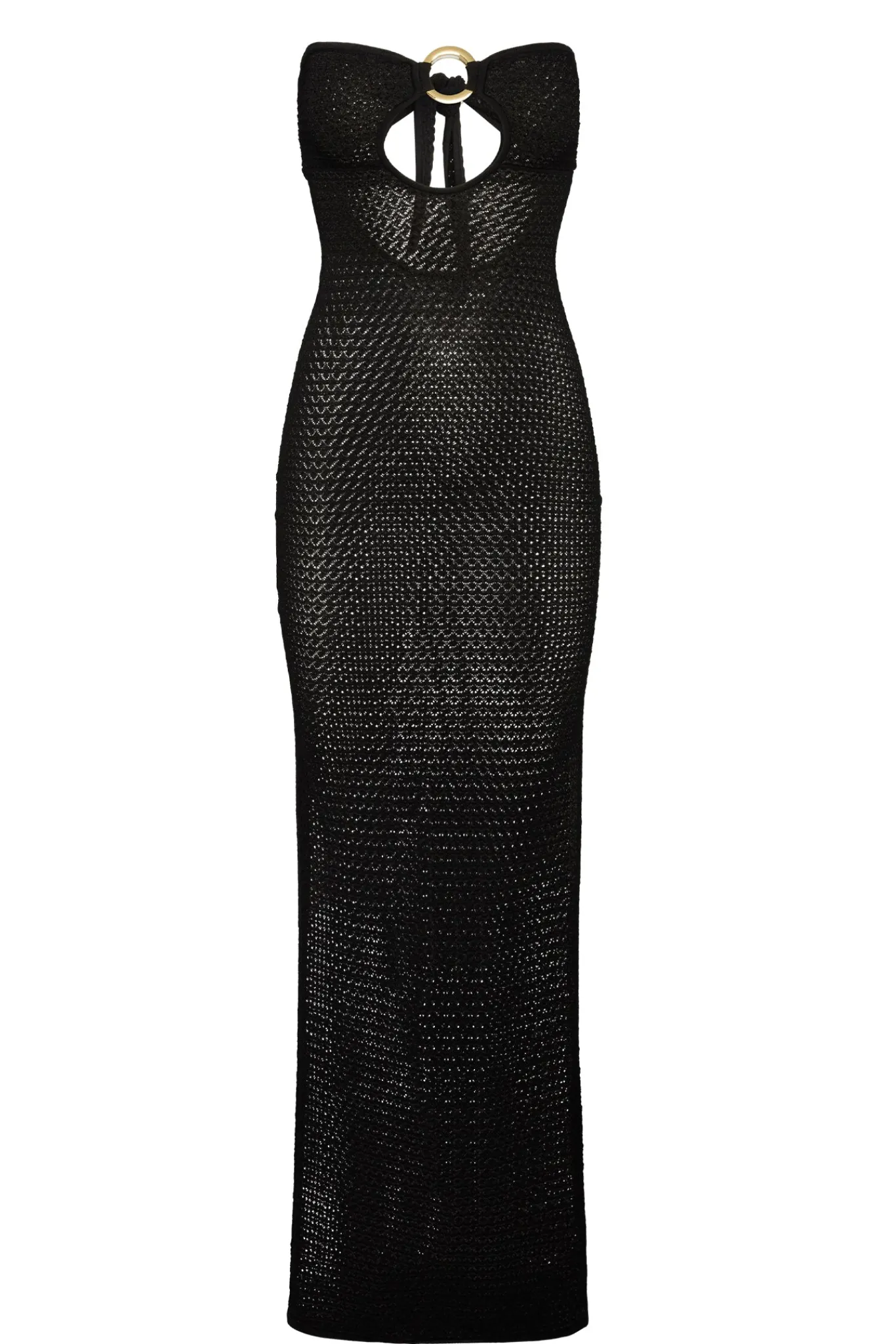 Turn heads in the Montego Bandeau Dress, featuring a plunging front keyhole for a flawless fit and a gold hardware ring for a touch of luxury. Side seam slits and an ankle-grazing, semi-sheer design tease just the right amount of skin for sunlit days and moonlit nights. Finished with an adjustable back tie, this piece is elegance redefined.