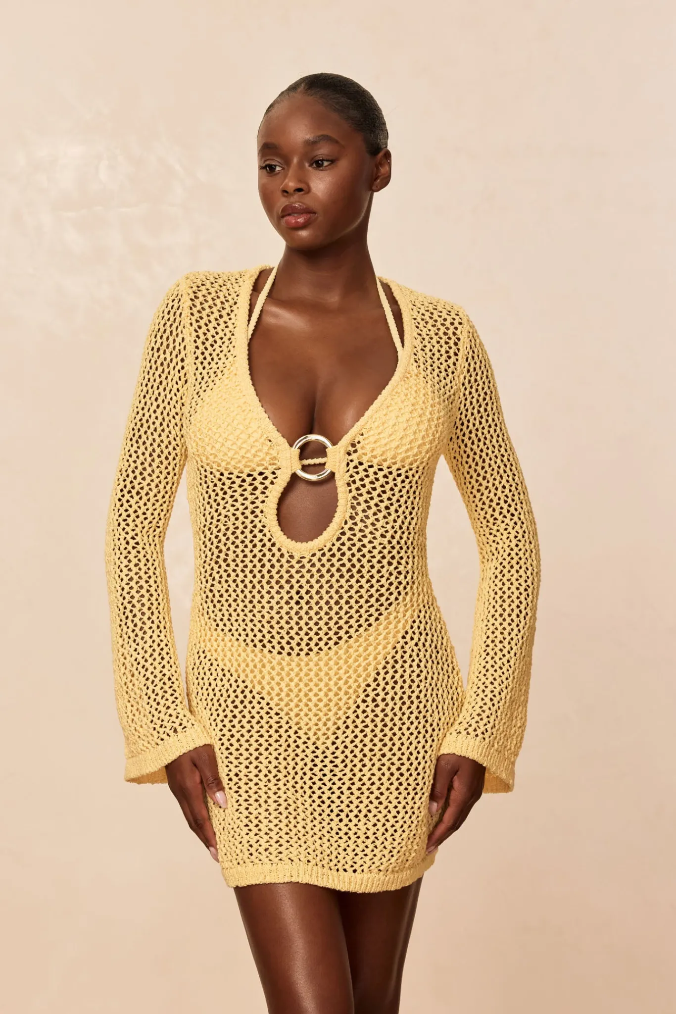 Our best selling dress now comes in a shorter option. This Montego Mini Dress is made in our petit crochet fabric with a plunging neckline, gold ring detail and a flattering silhouette that makes it the perfect dress.