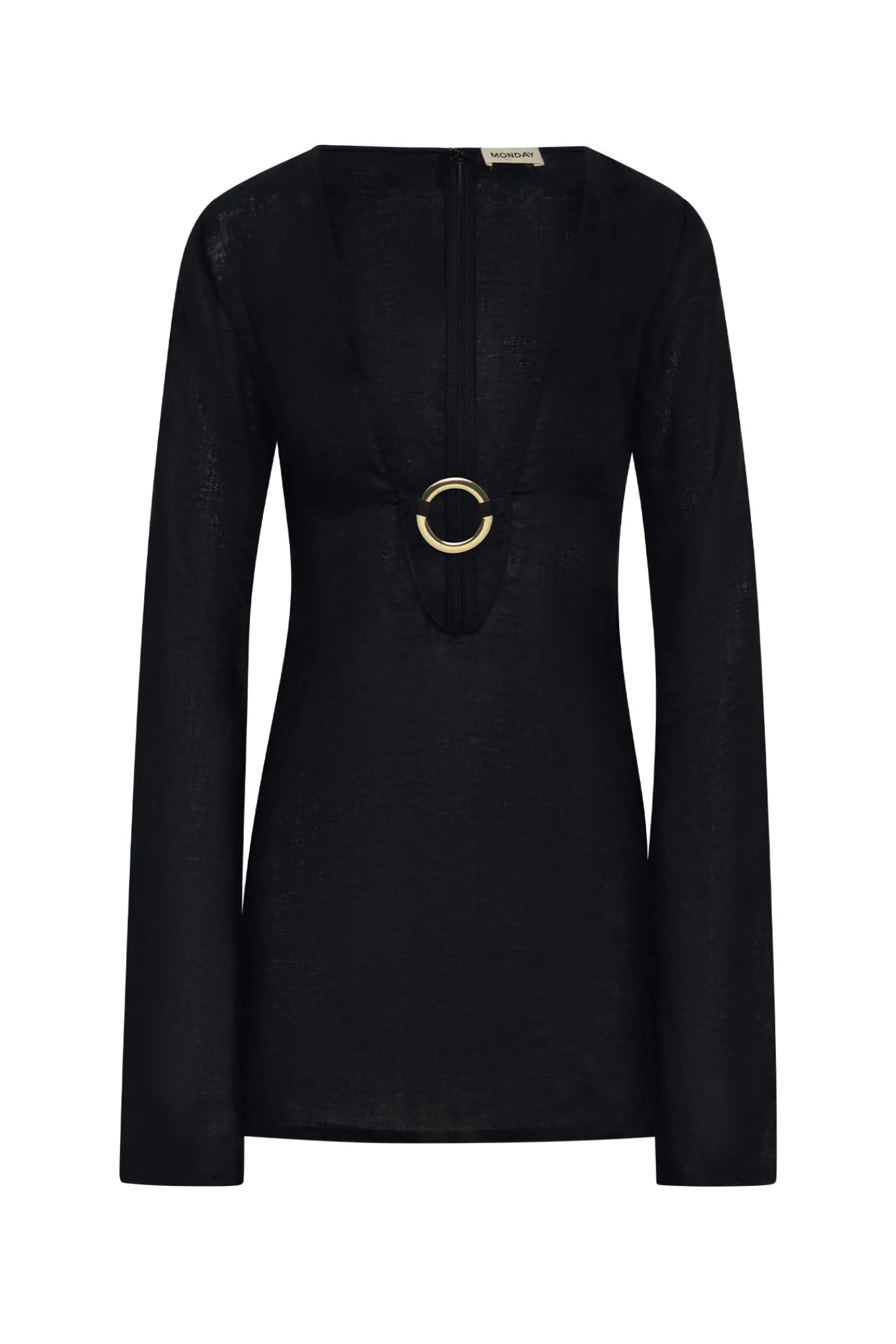 Plunging neckline w/ center front gold ring detail